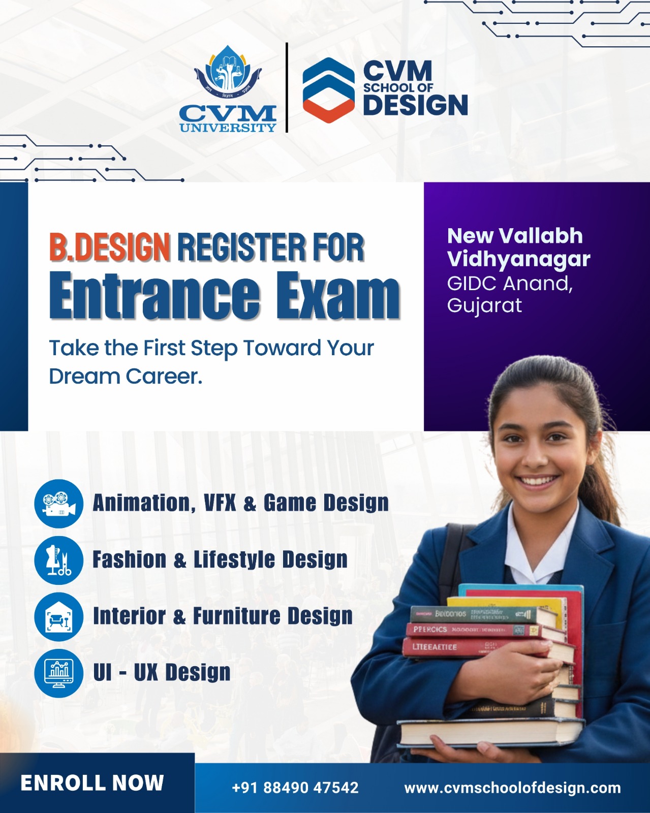 Making the decision to work in this industry brings up a world of opportunities and enables experts to produce memorable designs. CVM School of Design provides a thorough B Design in Visual Communication Design for individuals who are keen to enter this fascinating field. Being one of the top institutes for visual communication design in Anand, we give our students the tools they need to succeed in this fast-paced field.